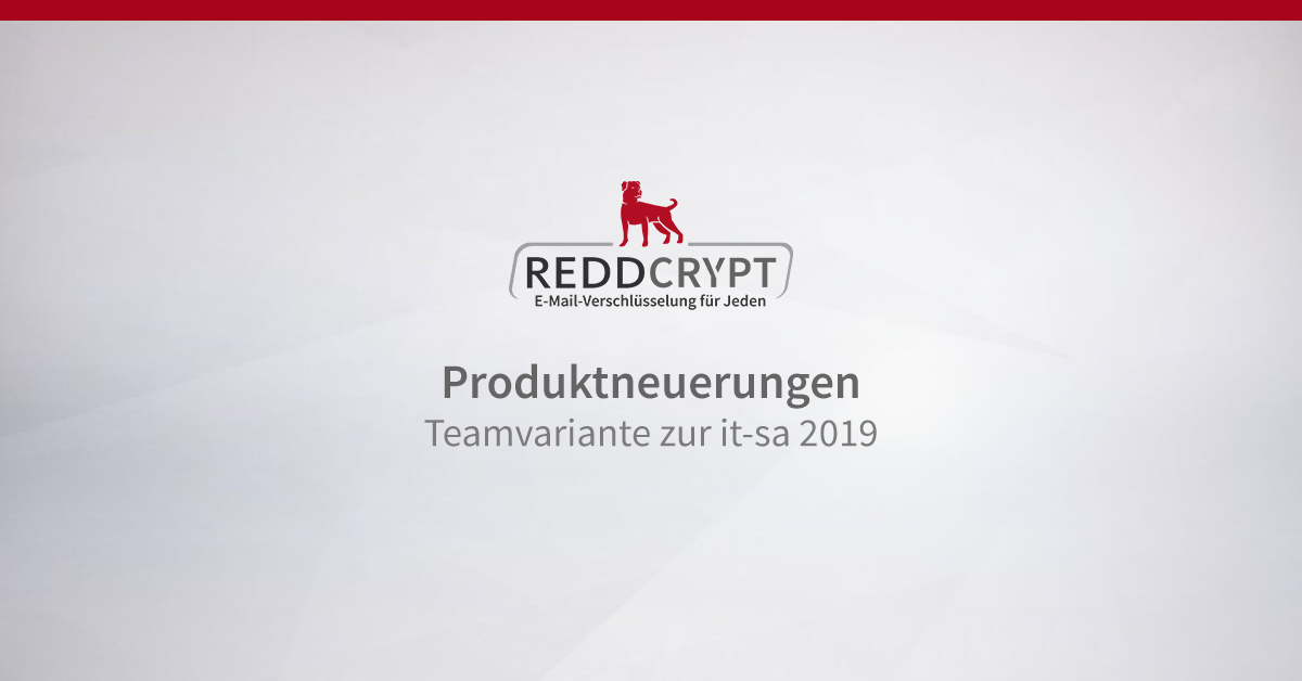 Auf der diesjährigen it-sa 2019 in Nürnberg zeigen wir Ihnen einen First-Look der neuen Teamvariante von REDDCRYPT. Die neue Teamlösung macht REDDCRYPT vor allem für den professionellen Einsatz in größeren Organisationen noch attraktiver. So ist beispielsweise eine Rechteverwaltung enthalten und Administratoren können die Verschlüsselungslösung zentral managen. E-Mails ausgeschiedener Mitarbeiter können durch Administratoren entschlüsselt werden, was für zuverlässige, nahtlose Kommunikation mit Kunden und Partnern auch bei Personalwechseln sorgt.